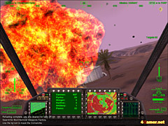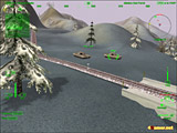 それから戦闘中に感心したのがヘルファイアミサイルの動作。この武器はレーザーで照射した相手を追尾する特殊なミサイルなのだが,通常の誘導型とは異なり,発射後に目標物を変更できるのが特徴だ。ゲーム中でもそれが可能で,複数のミサイルを発射して敵をロックオンし,目標を破壊したあとに次の敵にロックオンすれば,残ったミサイルはその敵をめがけて飛んでゆく。上手に使えば連続攻撃となり,敵に反撃のスキを与えぬまま全滅させられる。また,手動による誘導もできるので,慣れれば障害物越しに敵を爆撃するといった攻撃方法も可能だ。