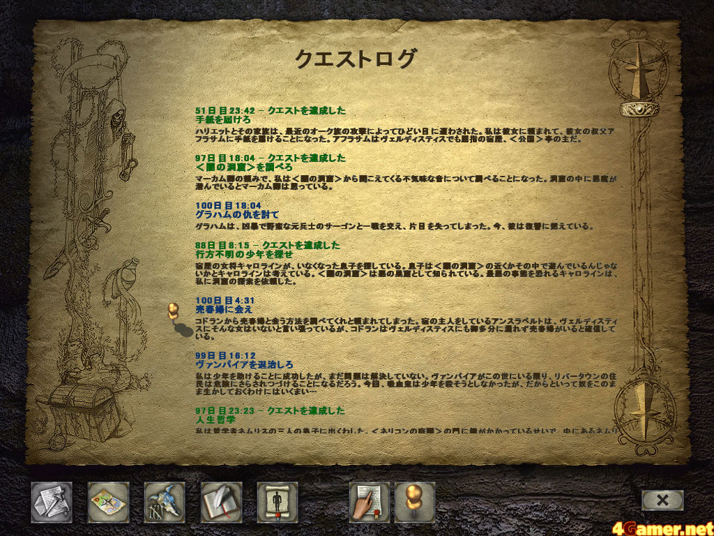 ストーリー/クエストを説明するのも,やはり簡単。「バルダーズ・ゲート」だ。「The Elder Scrooll」でも,「ソードワールドPC」「サバッシュII」でも構わない。メインストーリーとは別に,ゲームクリアの必要条件ではない,数多くのクエストが用意されている。