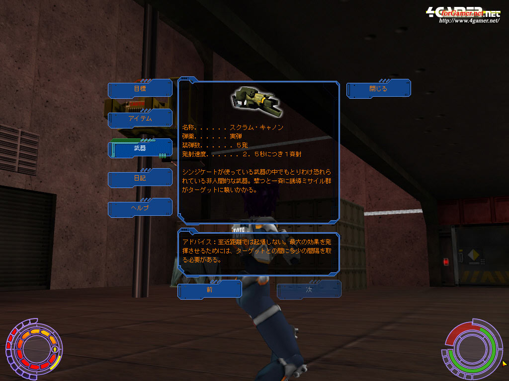 入手した武器の情報が表示される。弾薬は実弾かエネルギー弾か,装弾数が何発かというところは,かならずチェックしておきたい項目だ。スクリーミング・キャノンという生物兵器まである