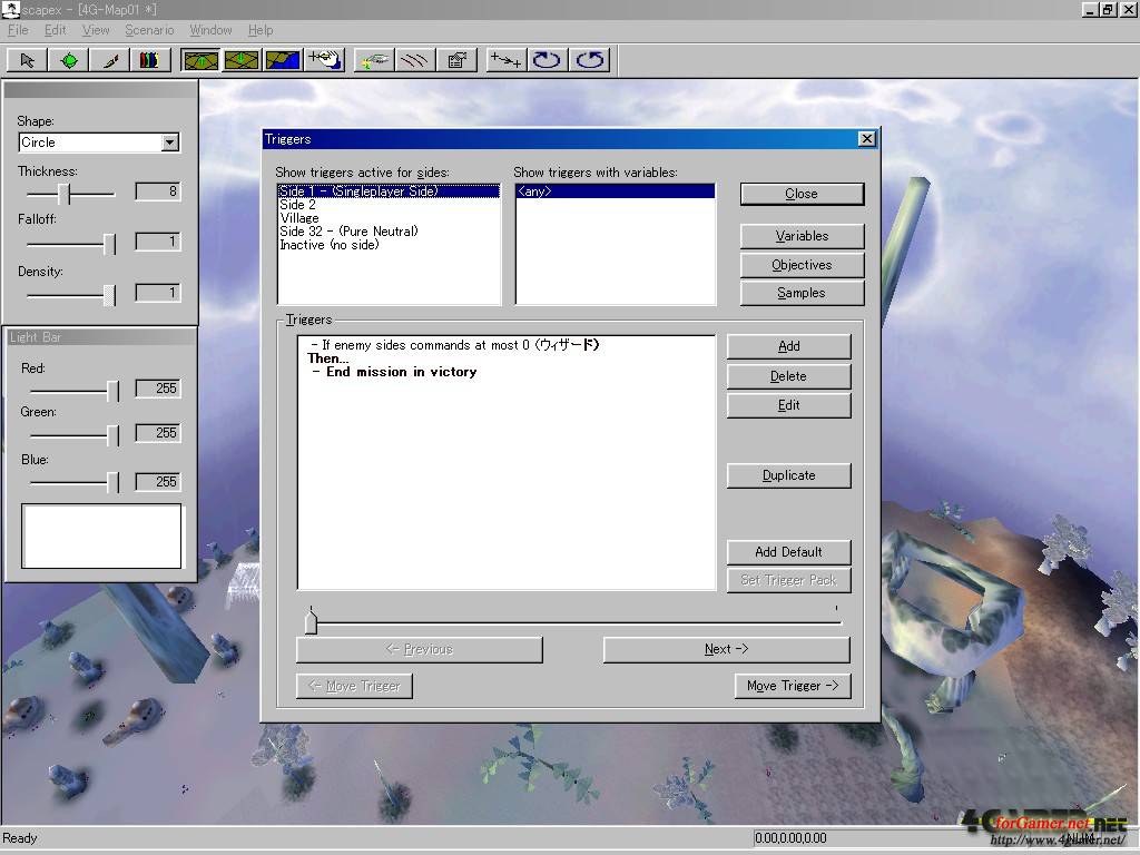 最後に,やっかいなトリガーの設定だ。これはマニュアルを読んでも充分な説明がないので,試行錯誤を繰り返すしかない。製品に付属するマップのトリガーを参考にするとかなり分かりやすいかもしれない。ちなみに,トリガー設定はインポート・エクスポートができるので,同じような設定のマップからトリガーを拝借することもできる。覚えておこう
