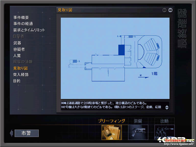 ブリーフィング画面で突入経路の確認。この画面などを参考にしつつ,現場の状況を前もって把握しておく必要がある。コンバットシム系の"すべて"はここに集約されているといってもよい
