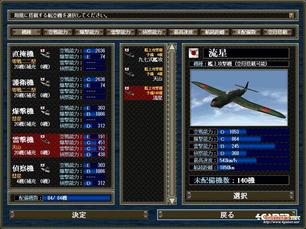 序盤の艦上航空隊は,九十六式艦上戦闘機と九十七式艦上攻撃機が基本。しかし戦力が乏しく,それほど大きな成果が期待でないので,まずは零式艦上戦闘機の投入が要。九十九式艦上爆撃機も早い段階で開発できるが,より高性能な彗星の投入がすぐに控えているので少し待って"零式+彗星",そして"零式+彗星+天山"という戦略で展開しよう。最後は流星