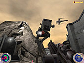 | こちらを狙う帝国軍のランドウォ−カー,銃くらいでは歯が立たない。空にはX-WINGの雄姿も見える | でこぼこコンビその一。「ルークさま〜」という声が聞こえてきそうだ | でこぼこコンビその二。話し掛けると「ピコピコピー」と電子音で応えてくれる |