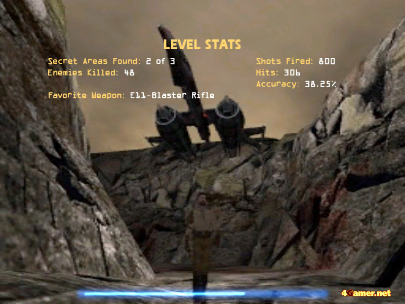 | 酒場での大乱闘。画面右下の丸いメーターはフォースパワーの残量を表示している | 各レベルの終了時に表示されるステータス画面。Accuracyが銃撃の正確さを表している | 敵の捕虜となった,相棒のJane。彼女にはこの後悲しい結末が…… | この人がルーク・スカイウォーカー。ちょっとフケ顔で,「ジェダイの復讐」のころのマーク・ハミルっぽいかな |