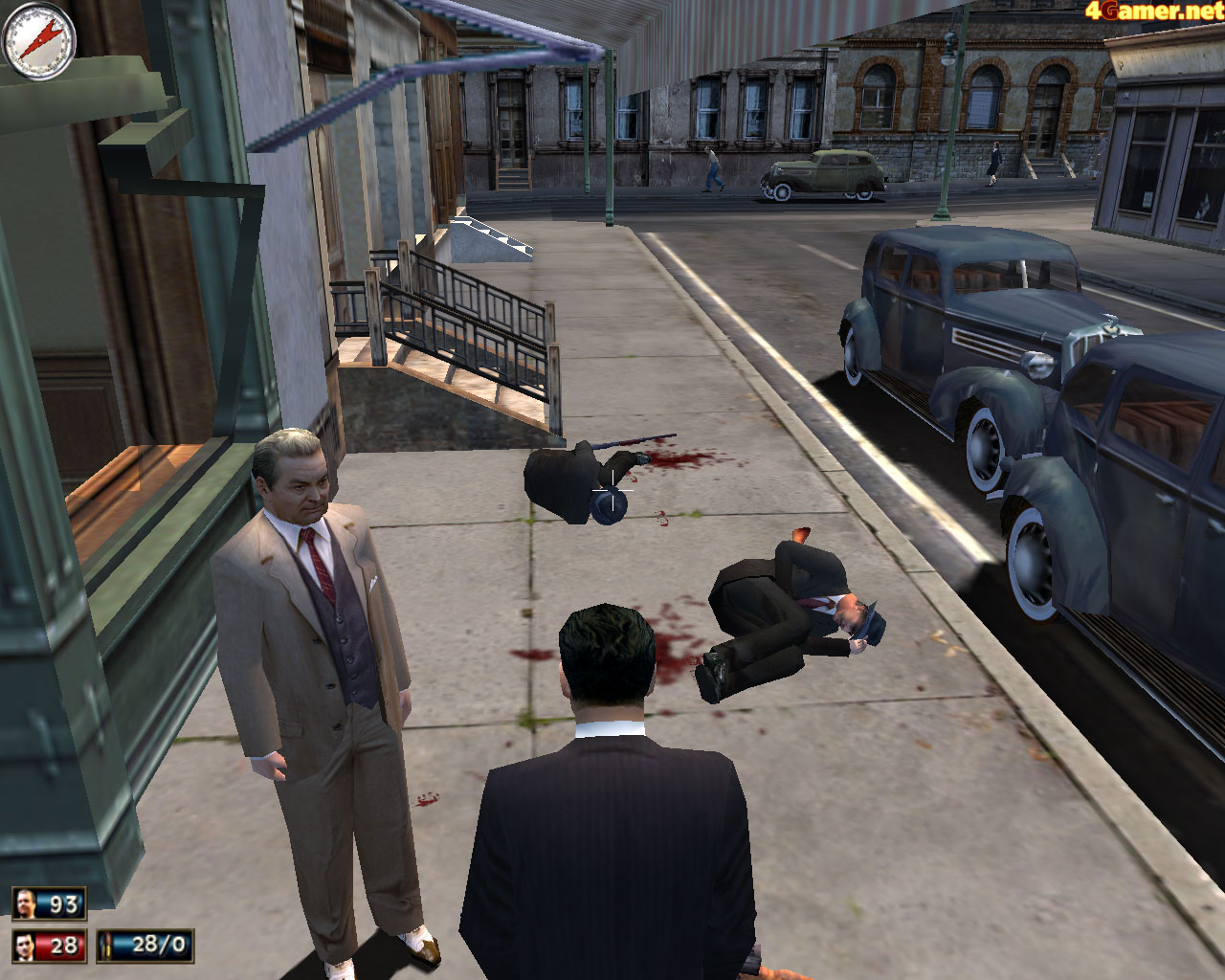 まず,マフィアにはGTA3のようなアナーキーさは少ない。GTA3では足の向くまま気の向くまま,通りすがりのオヤジ銃殺,ババア撲殺,アバズレ轢き殺しなどができた。マフィアでもやろうと思えばやれるのだが,やっても無意味だし,かえってミッションの達成の邪魔になってしまう。町中を走るのはつねに何らかのミッション中であり,その途中で意味もなく人を殺して追っかけてきた警官を倒しても,スキルが上がるわけでも金銭や武器が獲得できるわけでもない。