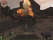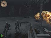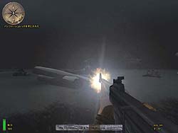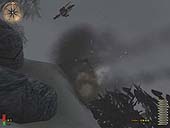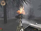 いきなり話は飛んで1944年12月24日のクリスマスイブ,いわゆるアルデンヌの森とよばれるベルギーの最激戦区。この壮絶な戦車戦が行なわれた地で,雪の中を駆け回ることになる。バーンズ軍曹は,前作MoHAAで有名になった6連装のロケット砲"ネーベルウェルファー"相手にトンプソンで突撃を強いられたり,トラックの護送と称して装甲車の貧弱な対戦車銃で何輌もの敵戦車を相手させられたりと,相変わらず恵まれない歩兵生活を送ることになる。たび重なる砲撃の豪雨の中,蛸壺(塹壕)から蛸壺へと飛び移りつつ衛生兵を探し回るステージが見どころだ。このあと暗闇の中から大量のドイツ兵が防衛ラインへと押し寄せてくるシーンに移り,対空砲で敵攻撃機を撃墜するラストまで大きなイベントの連続だ(セーブ/ロード機能を考えないなら,どう考えてもこのシーンが最も難しい)。「プライベート・ライアン」でも大活躍した,粘着爆弾で戦車に挑むシーンもある。