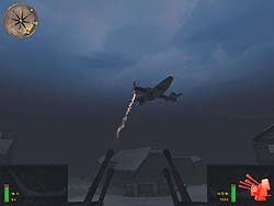 1944年6月6日,D-DAY。「リロード」の目玉シーンは,ゲーム開始直後からいきなり始まる。第501パラシュート歩兵部隊の役目は,約1万メートルもの上空から敵地に侵入することだ。ゲームはまさしく上空約1万メートルからスタートし,プレイヤー扮するジャック・バーンズ軍曹はただちに空へと放り出されるのである。この時点からすでにマウスによる視点操作が利くのでキョロキョロ見回してみると,足下には大型輸送機がゆったりと進み,周囲には自分と同じ哀れな空挺兵達がなすすべもなく落下に身を任せている。はるか眼下に広がる大地からは激しい対空砲火が幾筋も上がり(もちろん上空の我々に向けて),さっきまで足下にいた輸送機が目の前で炎に包まれていく。わぁきれい。