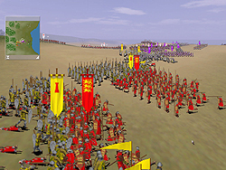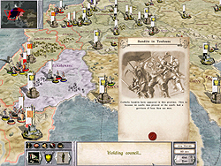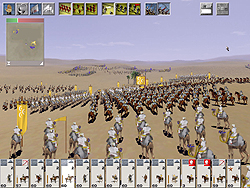 | 十字軍遠征などのイベントから分かるように,中東も戦場の舞台として用意されている。ラクダ部隊を指揮し,侵略者達を追い払うのだ | 薄く霧がかった橋の向こうには敵の大軍団が。この場合,橋の前に包囲陣を敷き,敵を各個撃破していくのが基本だ |