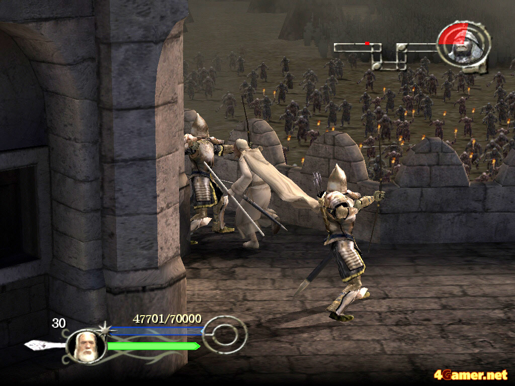 ミナス・ティリスの外壁では制圧してくるオークを食い止める。右上の赤いメーターで状況が分かるが,かなりヤバい状況だ…… |