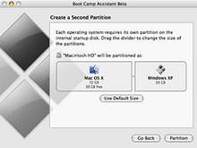| Intel MacにWindows XPをインストールするには,Boot CampでWindows用のパーティションを作成する必要がある。なお,全領域をWindows用にすることも可能 | Windows XPインストール後は,起動時にOSを選択できる。「Virtual PC」のように,Mac OS上でWindowsを動作させるようなことはできない |