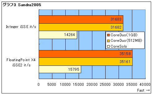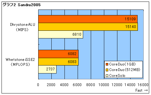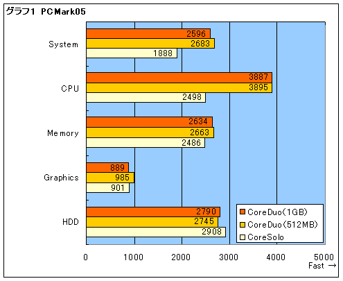 PCMarkの結果はグラフ1のとおりだが,Core Duo/1.66GHzがCore Solo/1.50GHzを圧倒。CPUのスコアは1.5倍弱の差がついている。コアが二つあるからといって,単純に2倍というわけにはいかないが,デュアルコアの能力を見せつけられた感じだ。