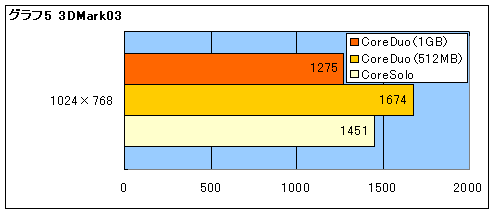 結果はグラフ5のとおりだが,Core Duo/1.66GHz(メインメモリ512MB)で1674というスコアを記録している。チップセット内蔵型のグラフィックス機能としては優秀な部類に入るだろう。さすがに最新の3Dゲームにはつらいと言わざるを得ないが,解像度や描画エフェクトを落とせば,ある程度対応可能だろう。また,少し前のゲームであれば,問題なくプレイできると思われる。