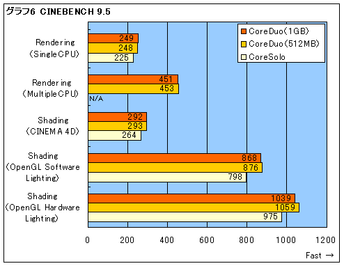 次に,OpenGL系のベンチマークソフトであるCINEBENCH 9.5(以下,CINEBENCH)を使用。その結果はグラフ6のとおりだ。このベンチマークソフトは,MacOS Xのベンチマークでも使用しているが,MacOS Xとは傾向が異なっているのが興味深い。