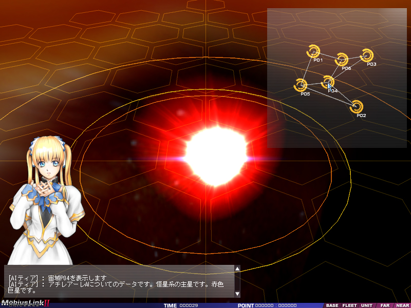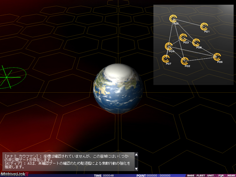 各シナリオにおけるマップは複数の宙域にまたがっており,前述のように宙域間はゲートで結ばれている。宙域間のつながりは「FAR」マップで確認でき,現在表示している宙域内のデータは「NEAR」マップに表示される。そこで確認できるのは星とゲート,艦隊の位置だ。ゲートに関しては通過時間も表示されており,これらの情報をもとにどう移動すればよいかを考えるわけだ。