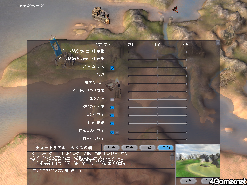 | キャンペーンのシナリオ選択画面。地図上のオブジェクトを選んでシナリオを選択。雰囲気を掴みやすい | シナリオの難度はかなり細かく設定できる。最初は父にパラサイトしておいたほうが何かと無難 | 最初は意外とつまずくので,とりあえずはチュートリアルで試行錯誤してみるのがいいだろう |