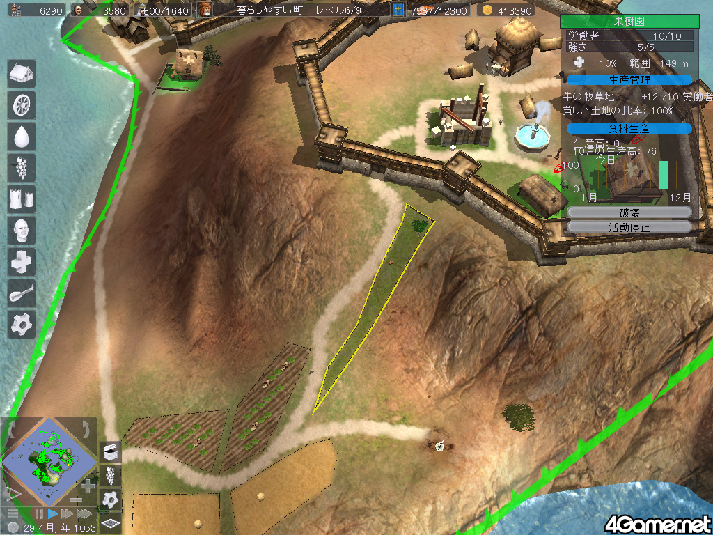最初にプレイヤーが直面する二律背反は,労働人口と食料供給の問題である。本作ではその規模に見合った食料供給がなければ,人口が瞬く間に減っていく。一方で,食料を供給してくれる生産施設(ありていにいって畑や果樹園)を稼動させて食料を得るためには,労働人口が必須になる。都市に居住区(つまりRTSにおける「家」)を増やせば,人口それ自体は簡単に増大するが,その人口を支える食料供給を確保しなければ都市は発展しない。