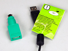 | 接続インタフェースはPS/2もしくはUSB 1.1。Microsoft製マウスらしく,接続する前にドライバソフトをインストールせよという注意書きがあるが,無視してもかまわない |