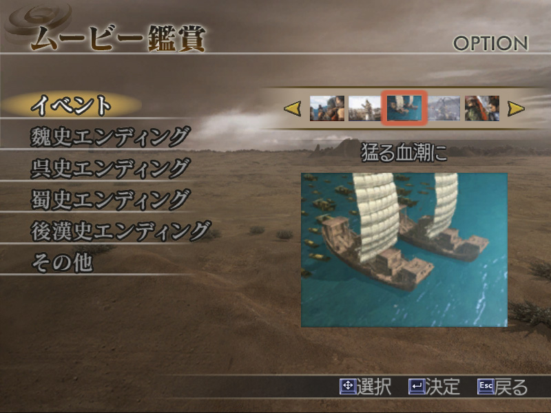 | 本作のメインである無双モード以外にも,与えられた課題をクリアしていくチャレンジモードなどがある | おまけとして三国志事典も収録。登場武将についての詳しい情報や,大まかな流れなどが確認できる | 一度見たムービーは,ムービー鑑賞でいつでも自由に視聴可能となる。桃園の誓いも燃える赤い炎も見放題 |