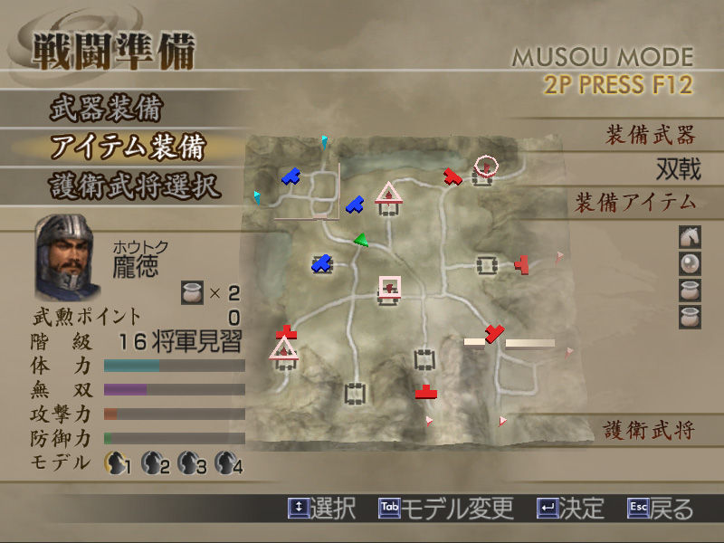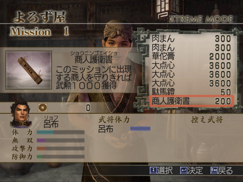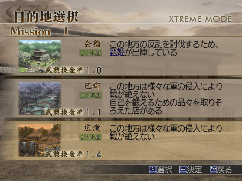 | 襲いかかる魏の兵士達を相手に,ブーメランのような武器を振り回して戦う祝融。かなり強い | どのミッションを選択するかも重要。武勲換金率(=難度)を参考にしつつ,残り体力を考慮して決定しよう | 各ミッションの間では,よろず屋でアイテムを購入できる。ここで必要なアイテムを買い,戦いの準備を |