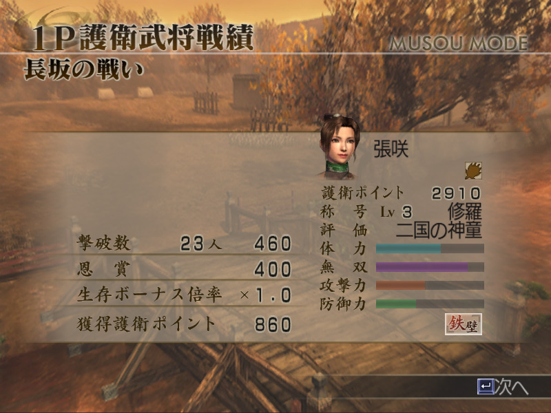ちなみにこの護衛武将,レベル1のときはかなり弱めのステータスとなっている。そのため,いきなり後半のステージで投入すると即死してしまう可能性大。ある程度レベルが上がるまでは,フリーモードを利用し,難度の低いステージでレベルアップさせて,それから本番ステージに投入したほうが得策だ。