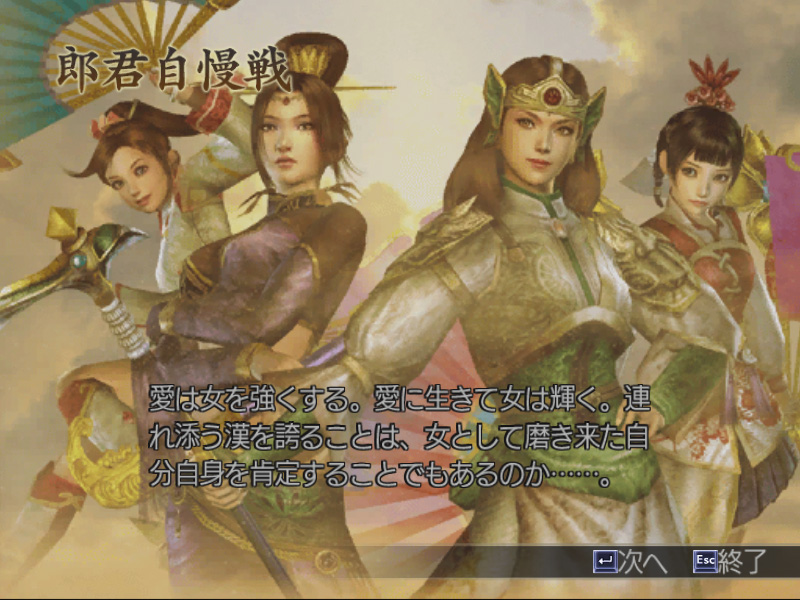 | 本作をギャルゲーとして楽しみたいなら,外伝モードの「郎君自慢戦」がオススメ。いやしかし何でもありですな…… |
