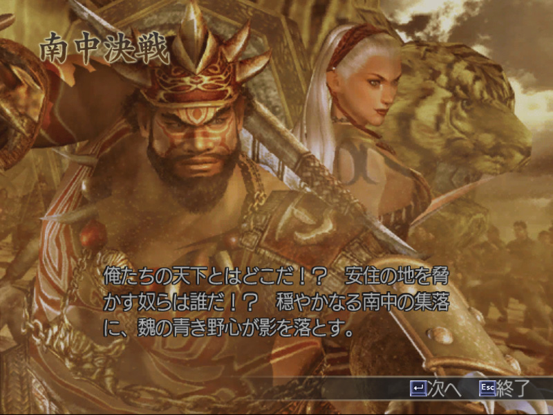 | 「猛将伝」で追加された新しいチャレンジモードのシナリオも,しっかりと収録されている | このシナリオは,劉備達が桃園の誓いをする前の物語。黄巾族から村を守り切るのが目的だ | 孟獲と祝融のコワモテ夫婦も,外伝モードで大活躍。自分達の居場所を守るため,猛獣達と共にいざ出陣 |