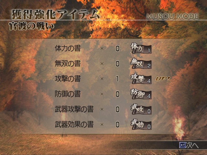 獲得した武器の数々や,所属武将の情報を閲覧できる幕舎では,他モードで入手した強化アイテムを使って,武将や武器を強化できる。好みの武将や武器をとことん強くでき,例えば劉備を肉弾戦で呂布に勝つぐらいにまで成長させることも可能。強化アイテムは,ステージをクリアすると何かしら一つはもらえるぐらいのバランスになっており,爆発的に成長するようなことはないが,コツコツとプレイしていくうえで,こういう成長の要素があるのは嬉しい限り。筆者の場合は,祝融をガンガンに強化していったら,旦那の孟獲が弱く感じるほどにまで成長してくれた。三国一のカカア天下の出来上がりである。