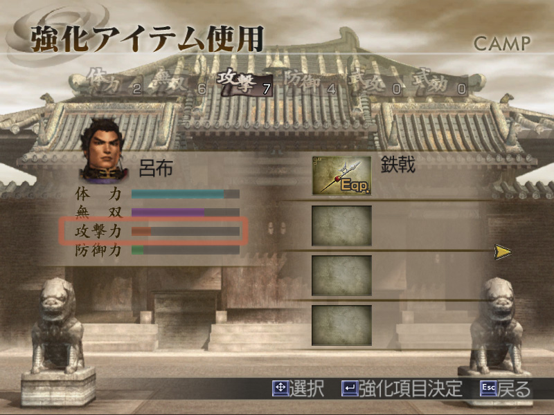 | もちろん武将は自由に選択可能。暴君董卓も一度修羅の道へ踏み入れば,一人で生き抜かなくてはならないのだ | 武器や武将を強化したいのであれば,まずはフィールドに落ちている強化アイテムを拾うべし | 拾った強化アイテムは入手しただけでは役に立たない。幕舎の「強化アイテム使用」で使用しよう |