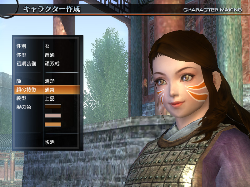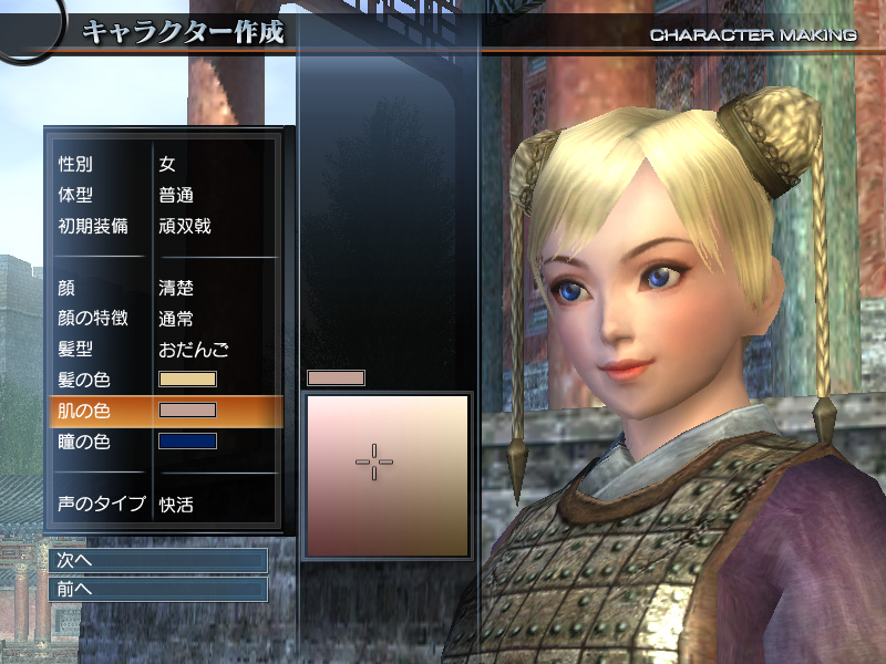 | カスタマイズ次第でさまざまな武将の作成が可能。東アジア系だけではなく,金髪お団子の女武将だってこの通り。肌や目の色などの色数はペイントソフト? と思えるほどバリエーションが豊富。これで思い通りの武将が作れることは間違いない!? | ||