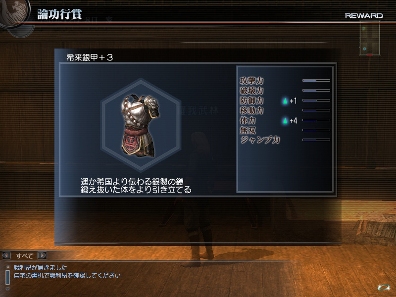 戦闘が終了すると対戦成績などが表示され,自動的に自室へ帰還する。戦場で箱を破壊してアイテムなどを入手している場合は,自室の書机でアイテム整理,武器の強化や装備の変更を行って,再び出陣することになる。