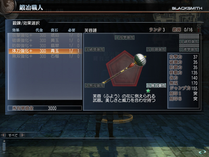 また武器の強化を行っている場合は,「?」の部分に「攻撃強化」「防御強化」「体力強化」「破壊強化」「無双強化」といった項目が表示されるようになり,初期状態とは違うパワーアップが楽しめる。これは武器の強化内容とリンクしていて,武器の「攻撃強化」と「体力強化」を,それぞれ3レベル上げていた場合の強化スロットは,
