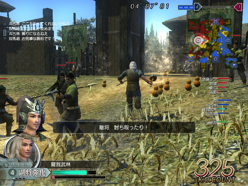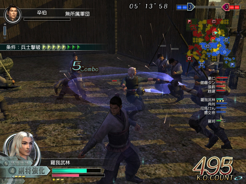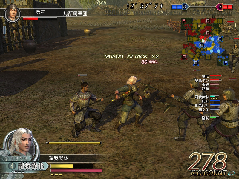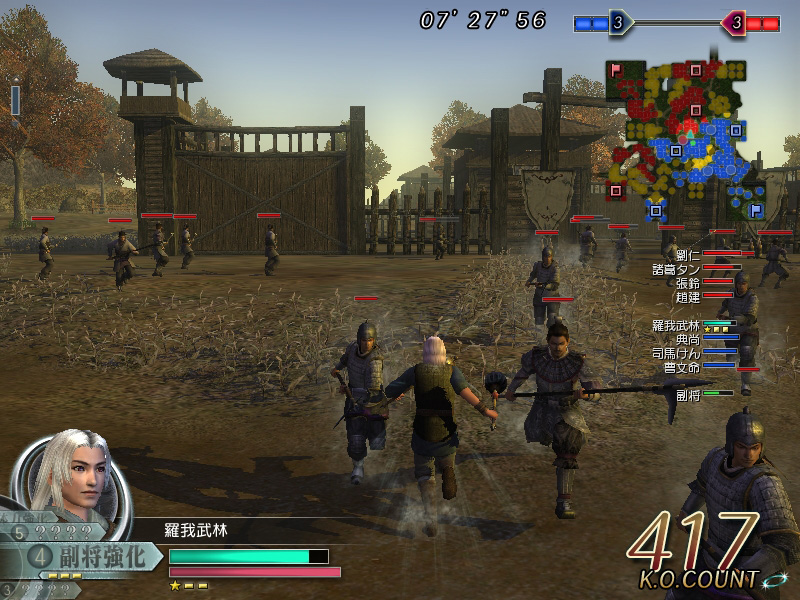 4段階めの「副将強化」と,7段階めの「連撃強化」は固定要素。この二つは文字通り,取得すれば副将が強くなったり,プレイヤーキャラクターの連続技数が増えたりする。とくに「連撃強化」は重要で,繰り返して取得すれば最大で6連撃まで増えるほか,連続攻撃数が最大になると武器ごとに設定された独自のパワーアップ,「究極強化」が可能となる。なお「副将強化」や「連撃強化」はプレイヤーキャラクターが倒されるまで効果が持続する。