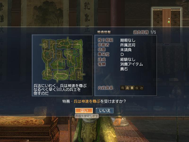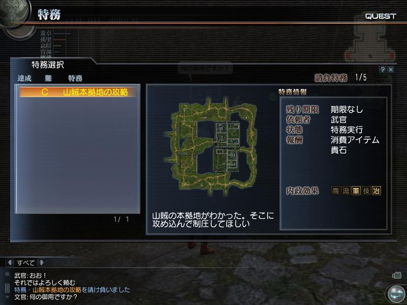 「激突」以外に,「特務」「争奪」という戦闘モードがある点については,前述したとおり。一般的なMMORPGでいうところのクエストに相当する特務は,無双武将や武官,酒場の主人といったNPCからもらえ,制限時間内に山賊の頭を退治したり,500人斬りを達成したりなど,バリエーションも複数パターン用意されている。ちなみに特務をクリアすれば,戦場で得たアイテム類に加えて報酬が得られるので,キャラクター強化には欠かせないモードといえる。