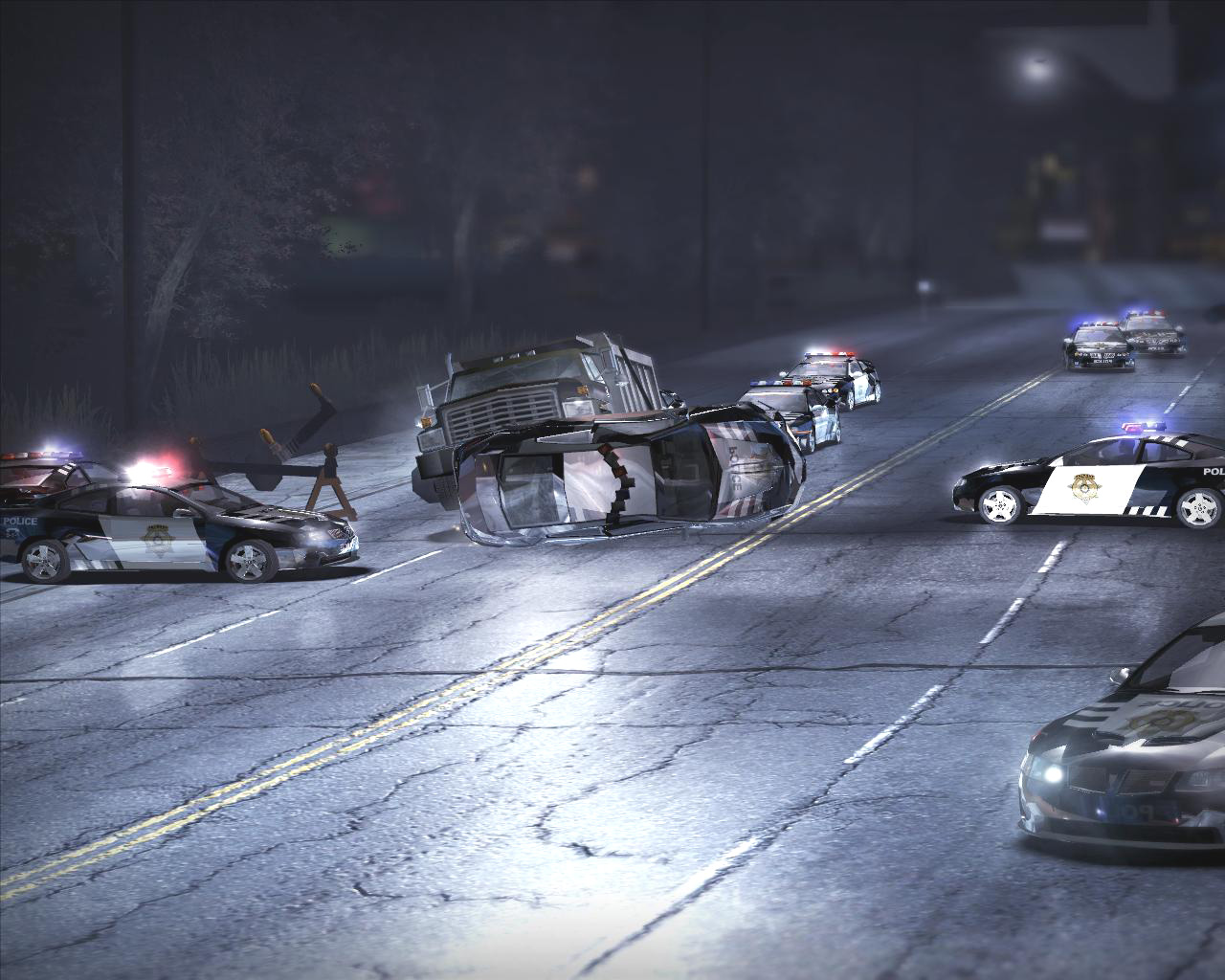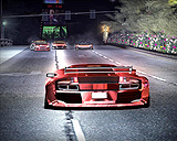 | 警戒レベルが上がると警察も精鋭集団で攻めてくる。写真のランボルギーニ・ムルシエラゴは4輪パンク状態で最高速は出ないのだが,パトカー同士でぶつかったり自爆したりと,結構,間抜けなときもあるので運が良ければ逃げ切れる。諦めちゃダメ! |