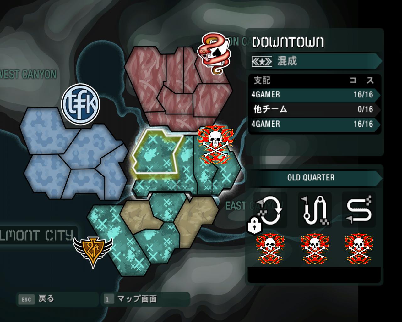 | レーススポットは好きな順番で挑めるので,得意なレースから始めるとよい。苦手なものはチューンしてから挑戦だ | このマップでエリアの支配状況が分かる(ドクロマークが自分)。上部のヘビマークは最後に倒すべきチームだ | 報酬カードの条件を満たすとアイテムが。レースで勝てばもらえるものもあるが,厳しい条件のついたアイテムもある |