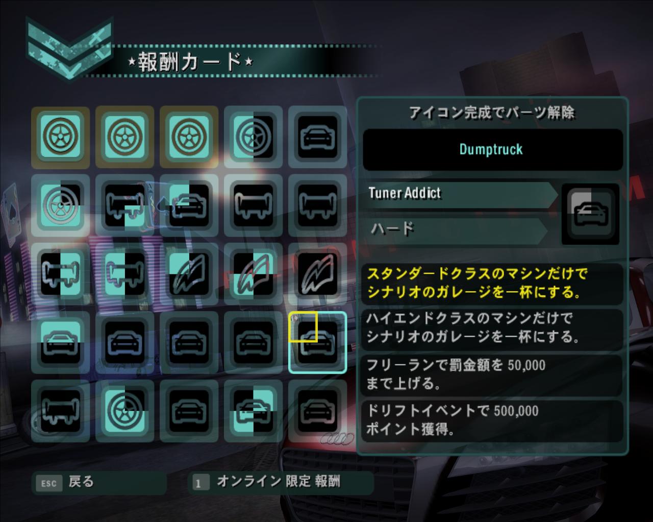 なお,マップ上に点在するレーススポットへは自由に街の中を走れる「フリーランモード」で向かってもよいが,ヒートレベル(警察の警戒レベル)が高いと,パトカーに発見される可能性も増える。警察との面倒なカーチェイスを避けたいときは,クイックリストからレーススポットを選択することで直接レースに参加できる。とはいえ,フリーラン中にアンロックされるアイテムもあるため,フリーランモードでも走っておく必要がある。アンロックのためにどういった条件が必要なのかは,メニューの「報酬カード」から確認できるので,取りこぼしなどないように。