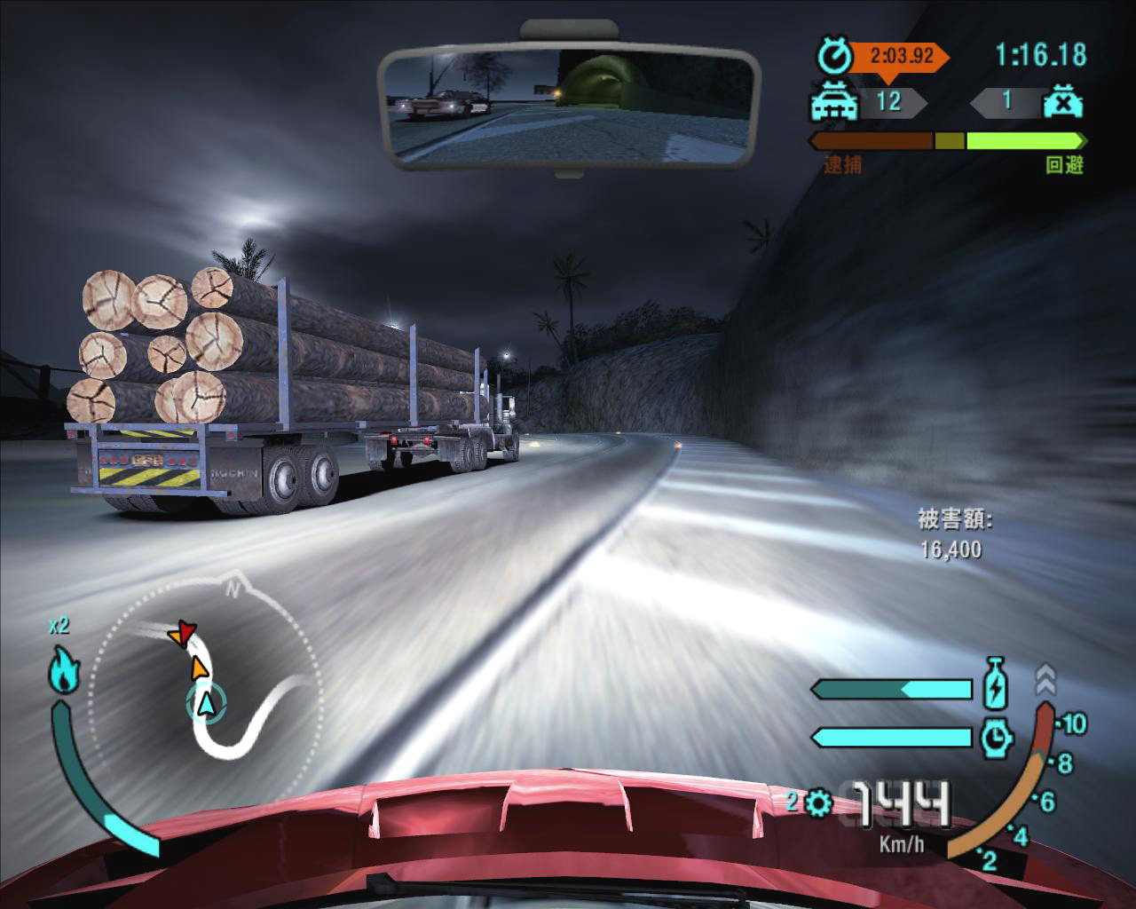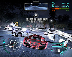 パトカーとのカーチェイスも前作と大きく変わった点はない。最初は張り合いのない弱っちいパトカーが相手だが,警戒レベルが上がるにつれて新鋭パトカーが次々と登場し,プレイヤーを逮捕すべく,あの手この手を使って取り押さえようとしてくる。怖いのはやはり,路上を塞ぐようにパトカーを並べ,抜け道として残したところに配置されるスパイクベルトだ。通過すると4輪ともパンクし,高速走行が不可能となる。ここは,時間経過をスローモーション化できる“スピードブレイカー”を使って切り抜けたいところだ。華麗なドライビングテクニックと街に点在する“パースートブレイカー”を駆使して,押し寄せるパトカーの群を蹴散らしてやろう。警察無線を傍受しながら凶悪犯になった気分で逃げ回るのは,なにより単純に楽しい。