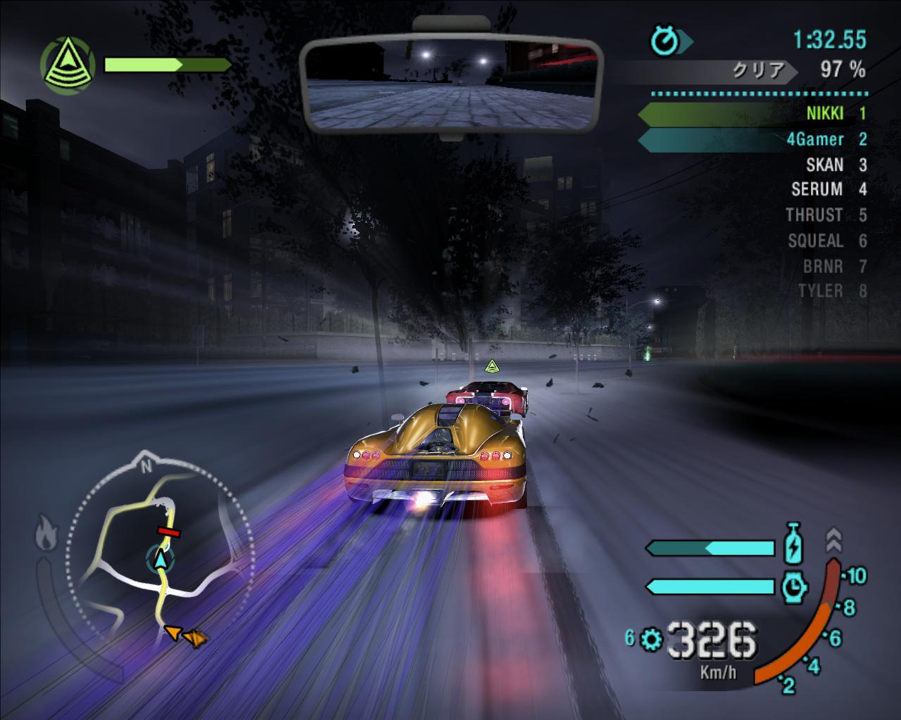 車種ごとの挙動の違いなどは再現されているものの,他車や道路上にある物を弾き飛ばしたり,壁にこすったりするのは当たり前なので,あくまでシミュレータではなくレースゲームだと思っていたほうが良い。セッティングについても,チューニングパーツの組み合わせで,アンダーステアやオーバーステアに割り振ったり,ニトロを「加速」から「持続性重視」にしたり程度の比較的大ざっぱな仕様なので,ステアリングデバイスなどは必要なく,ゲームパッドでも十分な手軽さだ。レース自体も比較的気軽にプレイでき,難度もそれほど高くないので,ドライブゲームの知識がまったくないような人でも,ストリートレースや警察とのカーチェイスを楽しめるだろう。