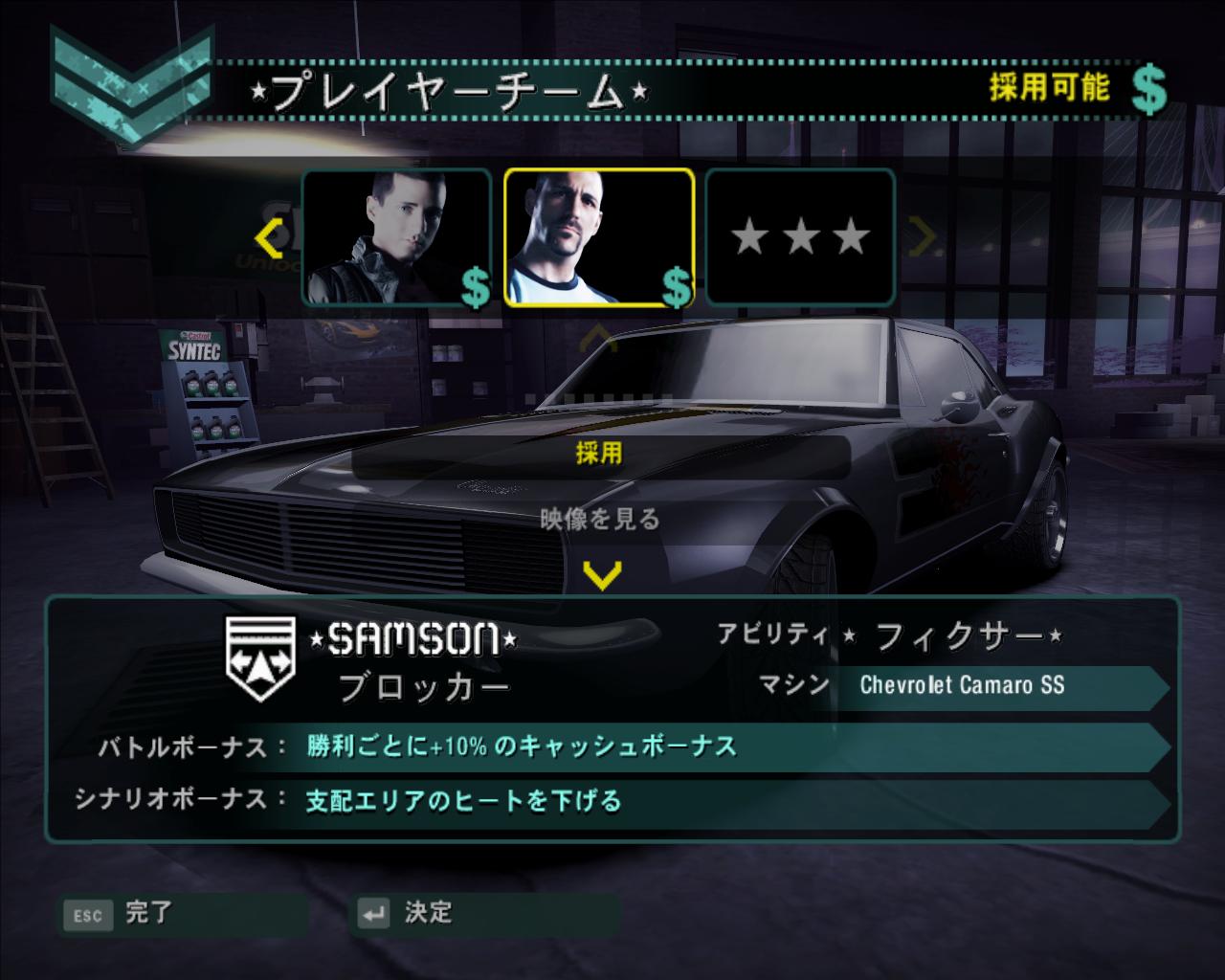 メンバーは,ライバルの行く手を阻む“ブロッカー”,プレイヤー車が背後に付くと空気抵抗が減少して2台の速度がアップする(ドラフトという)“ドラフター”,ショートカットできる道を探して指示してくれる“スカウト”といった役割を持ち,レース中に指示を送ることで,そうした仕事をしてくれるのだ。それぞれのメンバーには“スピードブレイカーとニトロが50%アップ”“勝利ごとに+10%のキャッシュボーナスアップ”“マシン購入時10%割引”といったボーナスが付いているため,そのへんも見極めて採用するといいだろう。ちなみにレース中はうるさいくらいにメンバーからの無線が入り,仲間と走っている雰囲気がうまく演出されている。