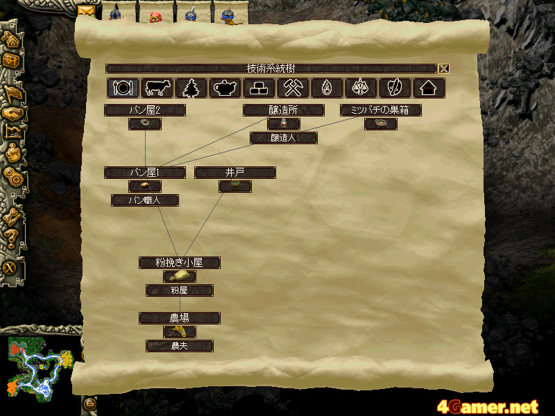 | インゲームで参照できるテクノロジーツリー。小麦作りからパン焼き,ハチミツ酒生産に至るブランチは伸ばすのが大変だ |