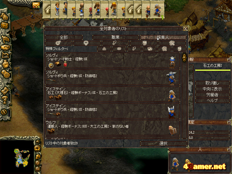 一般的なRTSには施設を建築したりリソースを収集したりといった生産活動用の「町の人」的ユニットと,それよりもはるかに数が多い戦闘用ユニットが登場する場合が多い。しかし「ノースランド」に登場するユニットは,基本的にはバイキングだた1種類のみだ。戦闘も生産も,このバイキングを兵士や農夫などの職業に就けることで行う。バイキングの男性はどんな職業にでも就けるが,高い技術を必要とする職に就くには,その下位職業に一定期間従事した経験を必要とする。転職は何度でも可能だ。