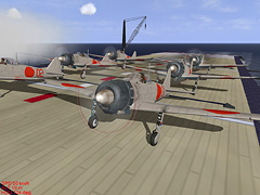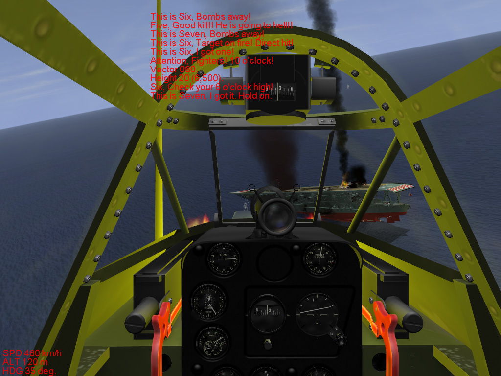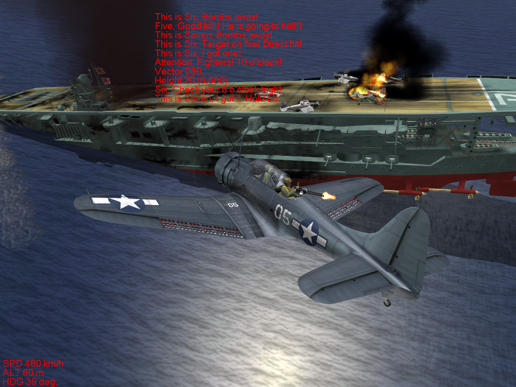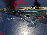 | 敵空母(赤城)に見事命中。敵艦はスクリューを見せながら沈んでいく。撮影のために近寄ってみたが,ホントは危険 | 別のシーンだが,敵艦からの対空砲火は凄まじいものがある。まっすぐ飛ぶと,あっという間に被弾して火ダルマ | 僚機が別の空母を屠った。ミッドウェイの海戦では,日本の大型空母4隻が海底に没したのである。とどめの銃撃だ |
