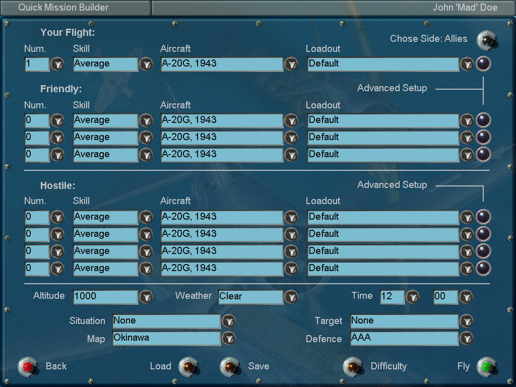 ユーザーインタフェースは,IL-2からほとんど変化がなく,ということはつまり,やや未整理な感じが残る。難度設定をしたい場合,普通は「Option」を開くが,実はそこではなく,何かミッションを選んだあとで行うのだ。まあ,このへんは単に慣れの問題ではあるが,ほかのゲームとはやや趣が異なるので,ビギナーにはちょっとやっかいかもしない。