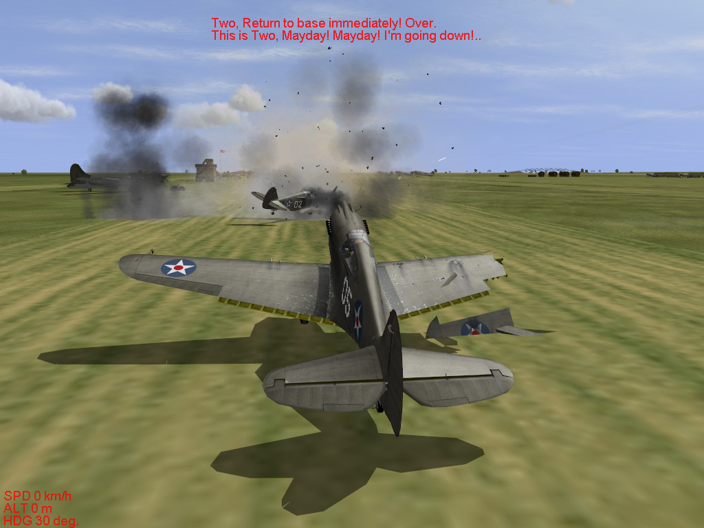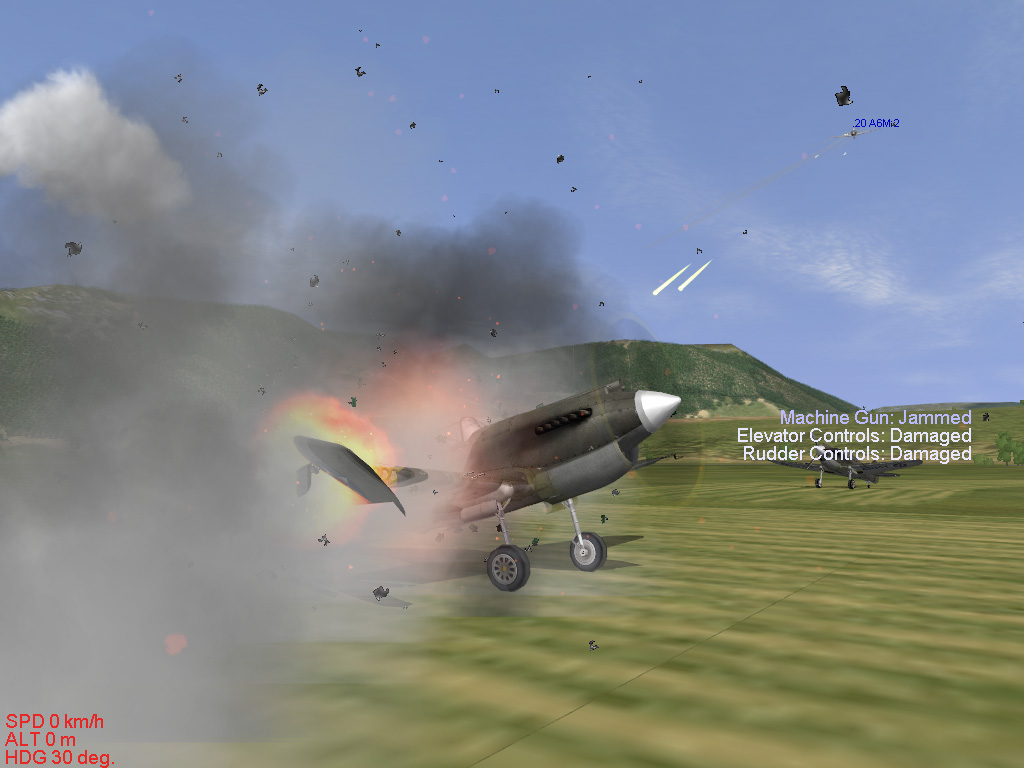 | 地上を機銃掃射するゼロ戦と,吹き飛ぶカーチス。撮影のため外から見ているが,操縦していると何がなんだかさっぱり分からないうちに木っ端微塵。前に駐機しているカーチスのパイロットが,コクピットから飛び出して滑走路を逃げていくのが見えたら,自分も後についていったほうがよさそうだ。くそう,日本帝国海軍め! 今に見てろ |
