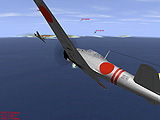 | 慣れないうちは,編隊飛行を続けるのも至難の業。あ,追い抜いちゃった。戻れ。あ,いない。みんなー,どこー? | 太平洋戦争は海と空の戦い。ほとんどが海または無人の島を舞台に,兵器と兵器が激しくぶつかり合ったのだ | ロールをかけて横転し,そのまま操縦桿を手前に引いて真下を向く。これが急降下爆撃だ。ダイブブレーキを開け! |