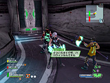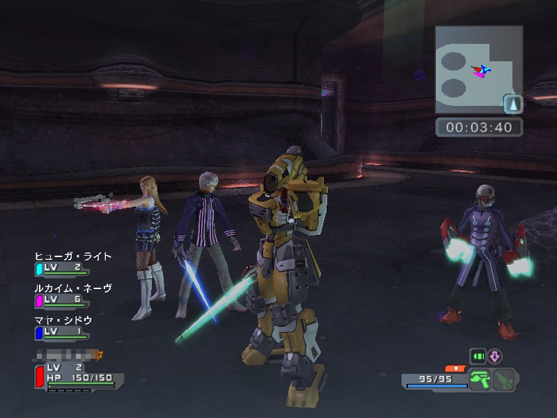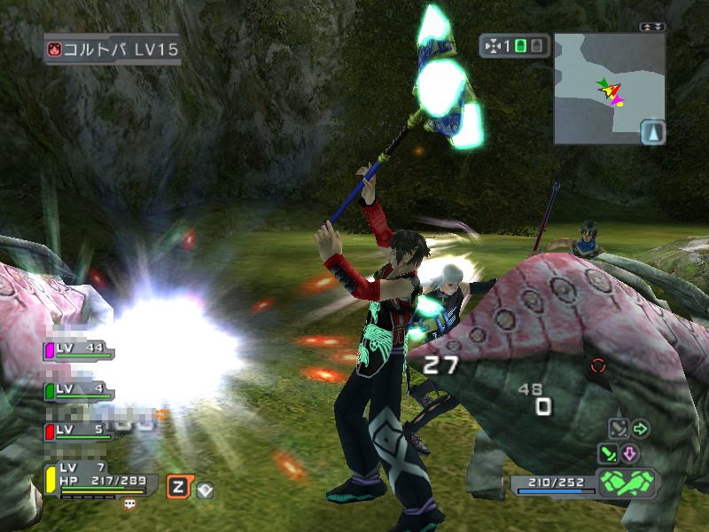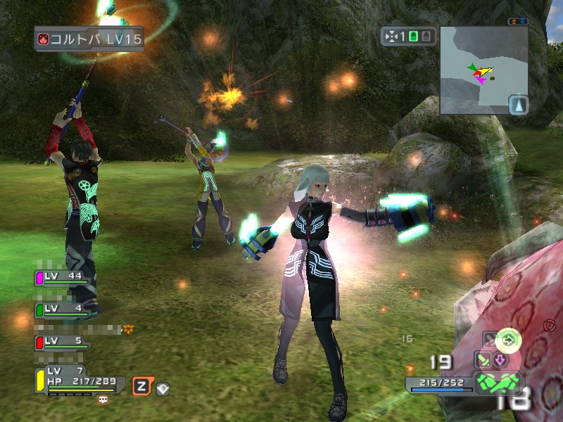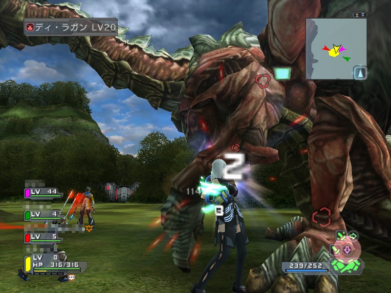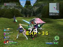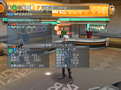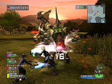 ミッションに関する説明が終わったところで,次は肝心の戦闘システムについて。こちらはPSOのシステムを発展させ,より爽快感のあるものになっている。PSOでは,ロックオンした敵に対してポン,ポン,ポンと3連続でタイミングよくボタンを押すことで連続攻撃が可能となっていたが,本作ではタイミングによる連続攻撃は廃止されており、適当にボタンを叩いているだけで連続攻撃が繰り出せるようになった。そのおかげで,敵を次々と倒していく爽快感がさらに強まり,初心者でも遊びやすいものとなっている。