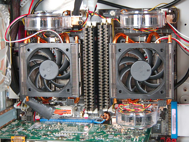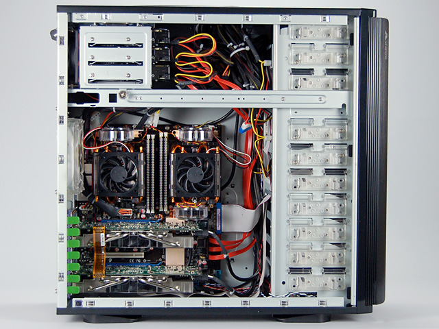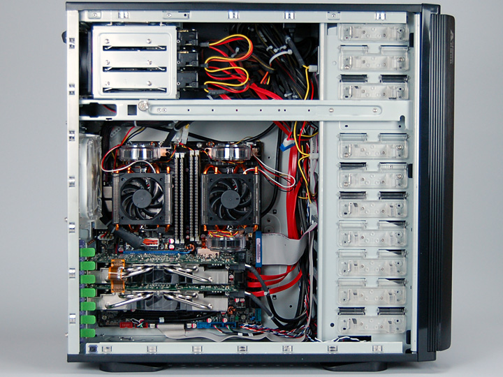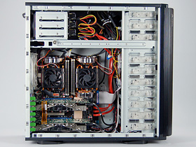 その理由は簡単。Tcase 56℃を実現するため,評価システムがかなり強力な冷却機構を搭載しているからだ。マザーボードへの電源(電圧)供給を行うVRM(Voltage Regulator Module)部には冷却ファンが三つ用意され,ケース背面には80mm角ファン×1と120mm角ファン×1,前面には120mm角ファン×1を搭載。さらに,ケース側面にはCPUの数に対応した2系統のダクトが設けられ,CPUクーラーそれぞれに直接外気を送り込むようになっているのである。