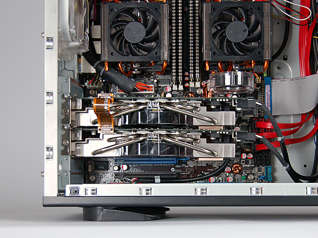 x16+x16 SLI構成のイメージ。2スロット仕様のカード×2の周辺が,ずいぶんゆったりした印象になっている |