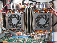 この冷却機構は低いCPUコア温度という形で功を奏しているのだが,一方,騒音はかなりのもの。ケースを閉じた状態で1m離れた位置からでもうるささを感じたほどで,作業しながらテレビを見ようと思っても,テレビの音声は聞こえなかったりした。この条件で電源を投入してからWindowsが起動するまでの動作音を,録音して「こちら」にUpした(5.0MB:29秒,WAVE)ので,興味のある人は聞いてみてほしい。