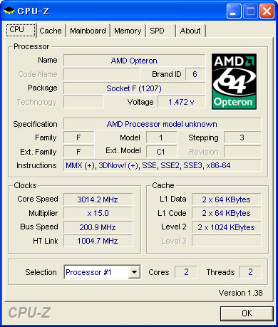 | Athlon 64 FX-70シリーズへの対応を謳う「CPU-Z 1.38」でチェックしてみると,「model unknown」と出た。実際の製品と微妙にステッピングが異なる可能性はありそうだ |